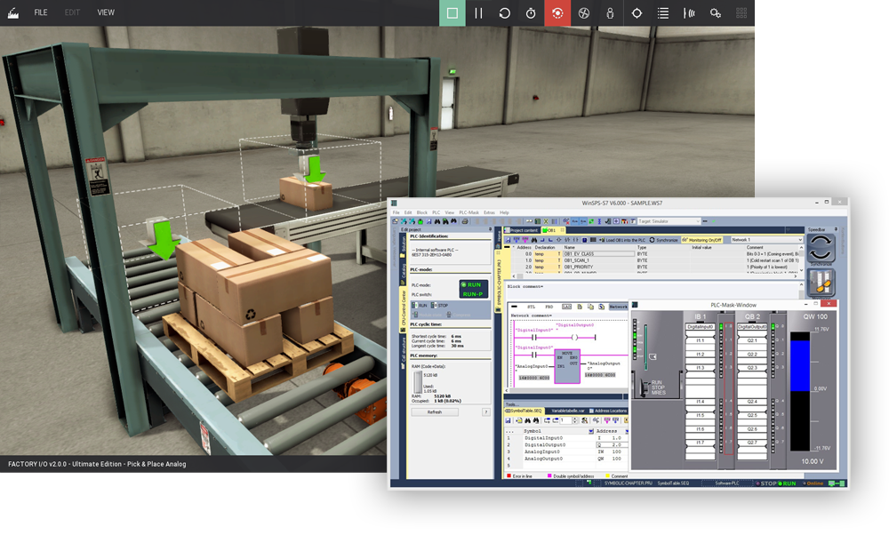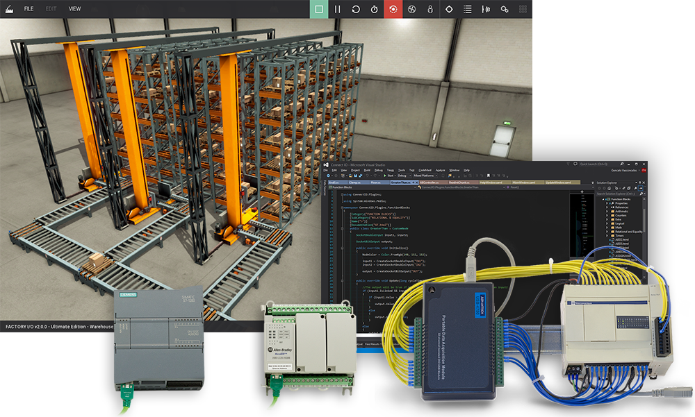 Factory I/O Ultimate Edition is a universal solution that works with a wide range of automation technologies including PLC, SoftPLC, PLC simulators, Modbus, OPC, and many others. Can be wired to any PLC model through interface boards and allows users to develop custom I/O drivers and extensions using an SDK.